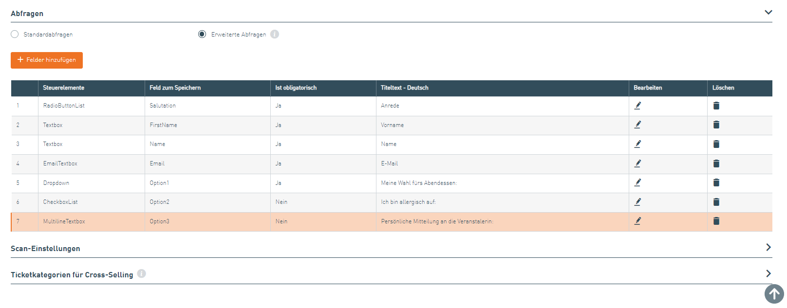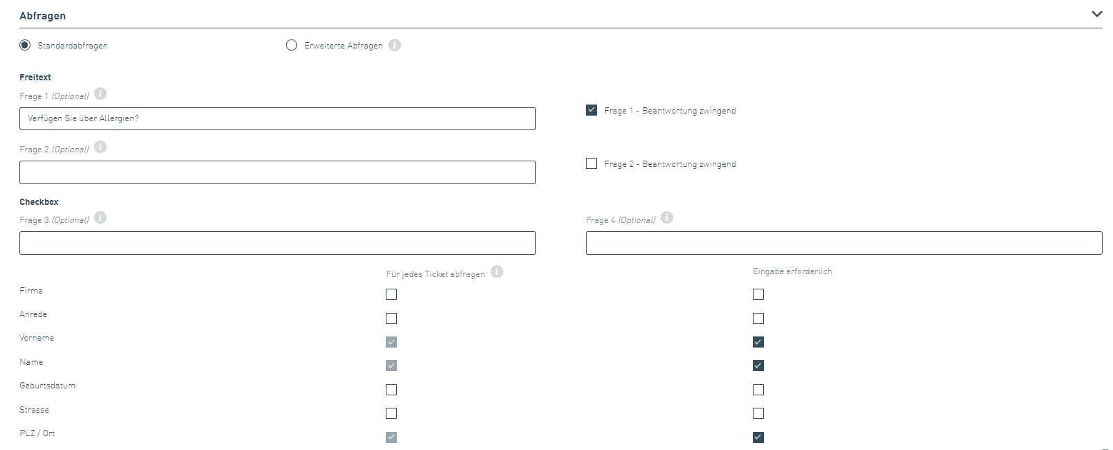 Click on the small pencil under "Edit" for the desired ticket category. Then open the "Queries" tab. You can activate common queries and specify whether they should be mandatory fields. You can then view the entries made by your ticket purchasers in the corresponding column of your ticket list.